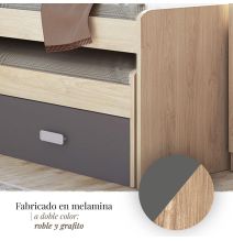 Cama Compacta + Cama Nido: Esta cama doble está diseñada para colchones de 90 cm, siendo ideal para habitaciones infantiles y juveniles. Su cama supletoria proporciona un espacio adicional para alojar cómodamente a tus invitados. Además, cuenta con cajones inferiores que son perfectos para almacenar ropa, juguetes, zapatos y más, manteniendo el orden en el dormitorio. Versatilidad para Todo Tipo de Hogares: Gracias a su tamaño compacto, puedes colocarla en cualquier dormitorio sin preocuparte por la amplitud del espacio. Su color neutro permite que se integre fácilmente en cualquier estilo decorativo, ya sean modernos, clásicos o nórdicos. Medidas y Materiales: • Estructura: Fabricada en tablero de melamina de primera calidad, con un acabado en efecto madera de roble que aporta calidez y elegancia al ambiente. • Dimensiones: 72 cm (alto) x 98 cm (profundo) x 198,4 cm (ancho). • Peso: 50 kg. • Nota: No incluye colchones, que deben adquirirse por separado. ¡Transforma la habitación con esta funcional y estilizada cama compacta con cama nido!